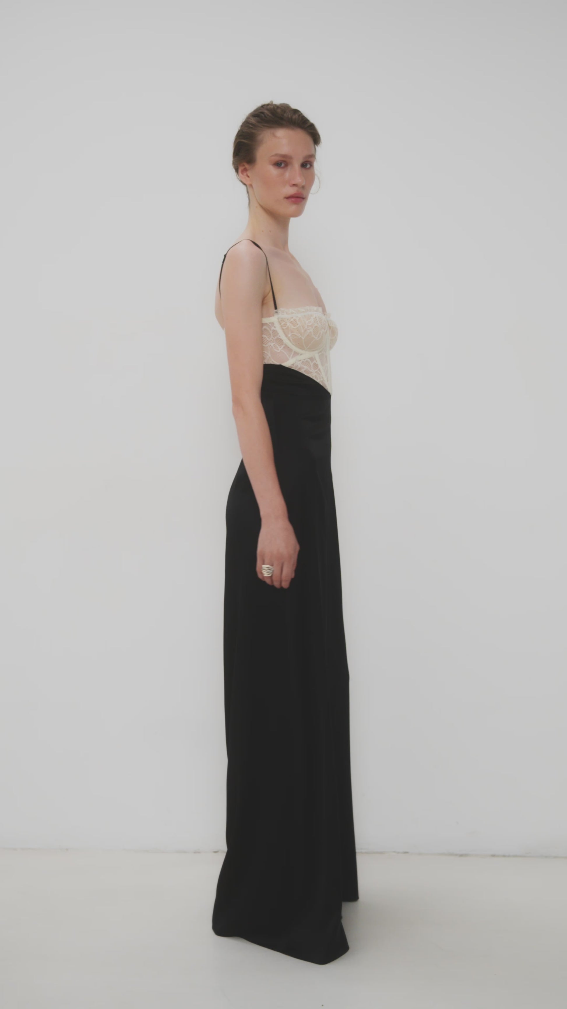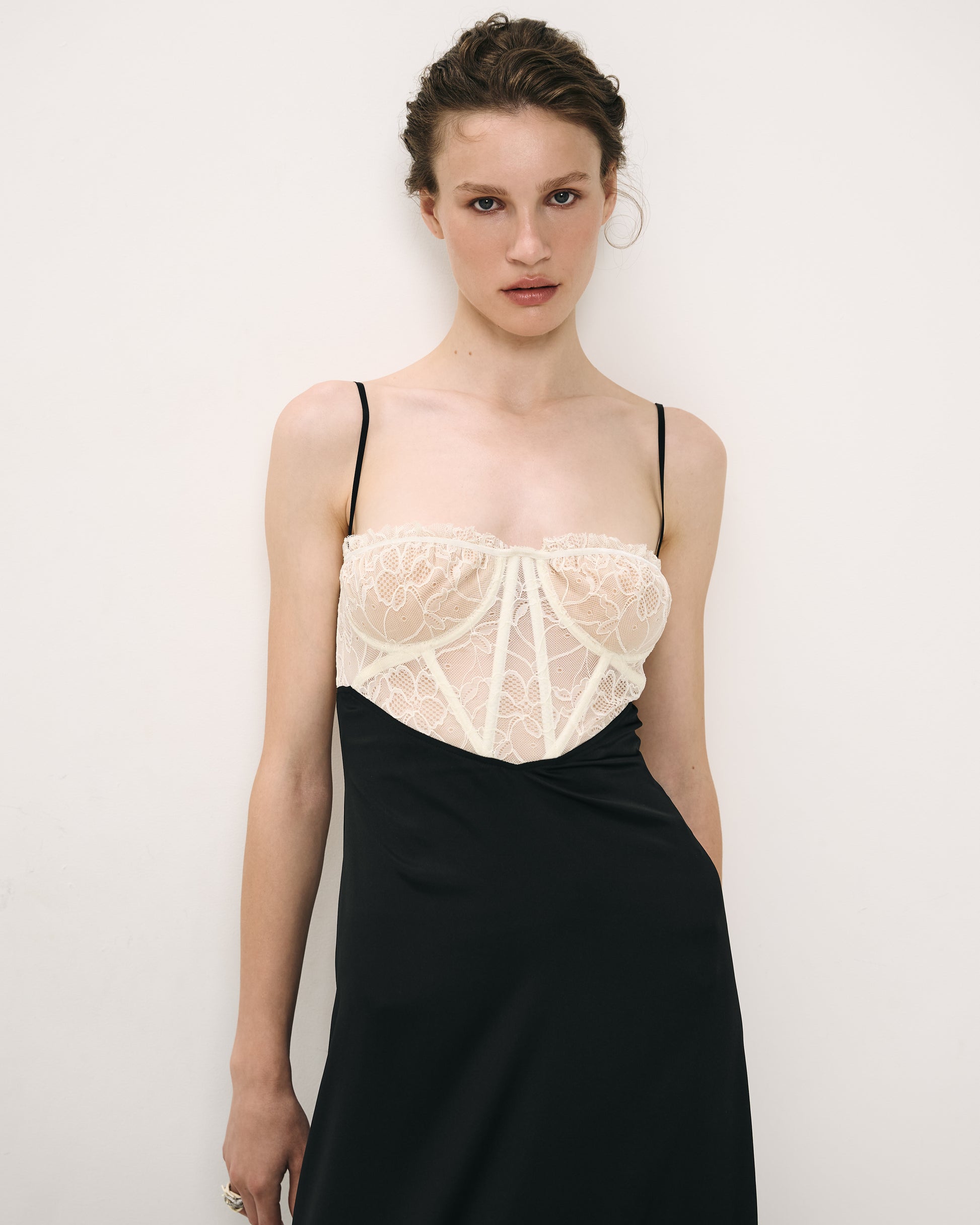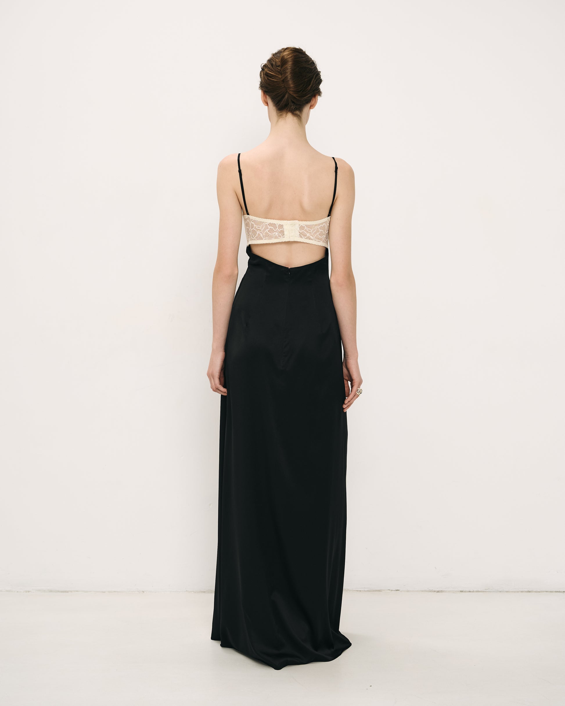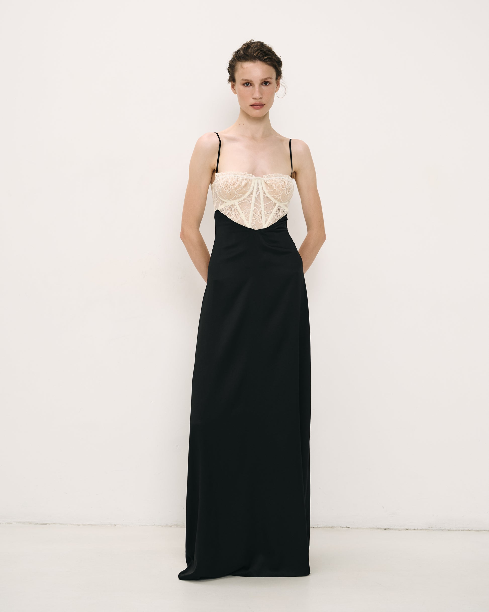 Виготовлена з чистого чорного шовку, сукня ніжно торкається шкіри, пробуджуючи чутливість і жіночність. Корсетний ліф із кісточками забезпечує ідеальну посадку, підкреслюючи бюст і талію. Чашки з подвійного шару сіточки, оздоблені ніжним мереживом - непомітні, але водночас легкі й делікатні, додаючи образу витонченості.